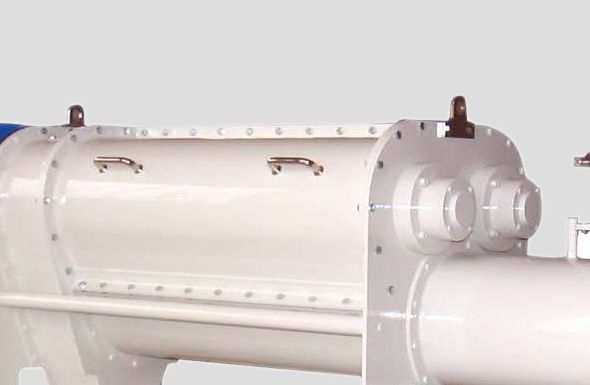 The hammers on the three shafts take over the product and move it slowly along the shell surface towards the outlet.After passing through the dampener chamber the wetted product drops through the outlet part.